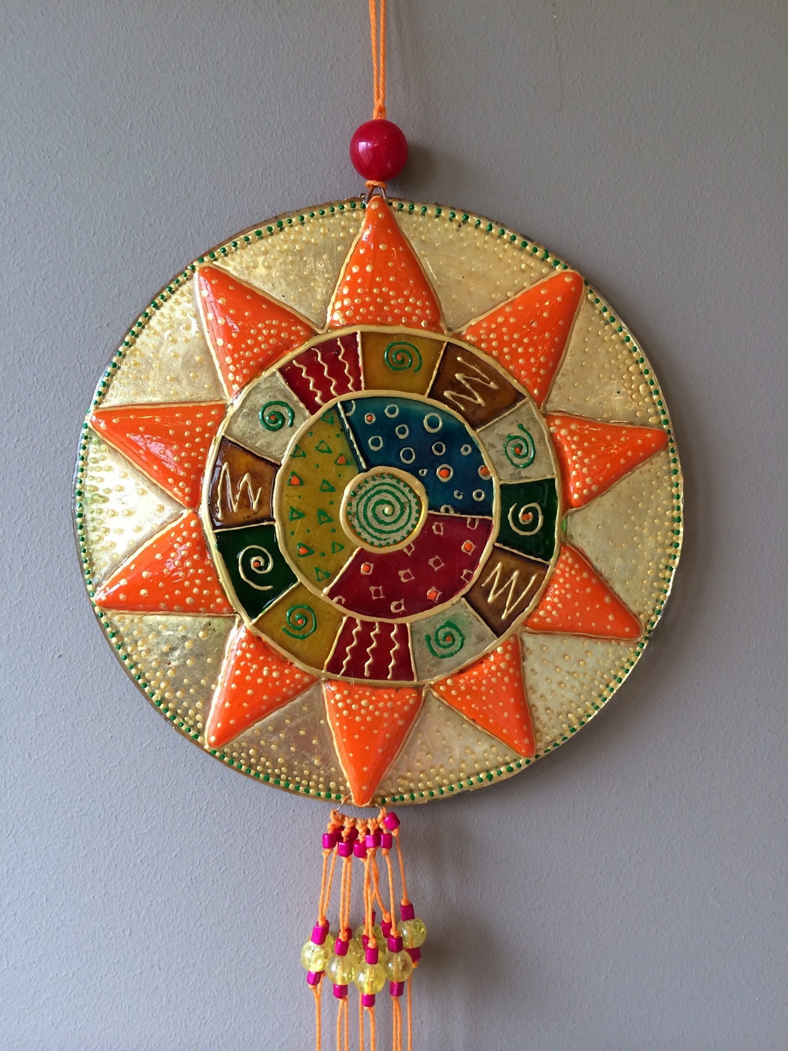 Immerse your environment in the serenity of our 'Mandala' Glass Artwork, a symbol meticulously designed to cultivate a sacred atmosphere in any space. This orange, hand-painted masterpiece is crafted from flat fused-glass, adorned with vibrant colors and intricate patterns that enchant and captivate.