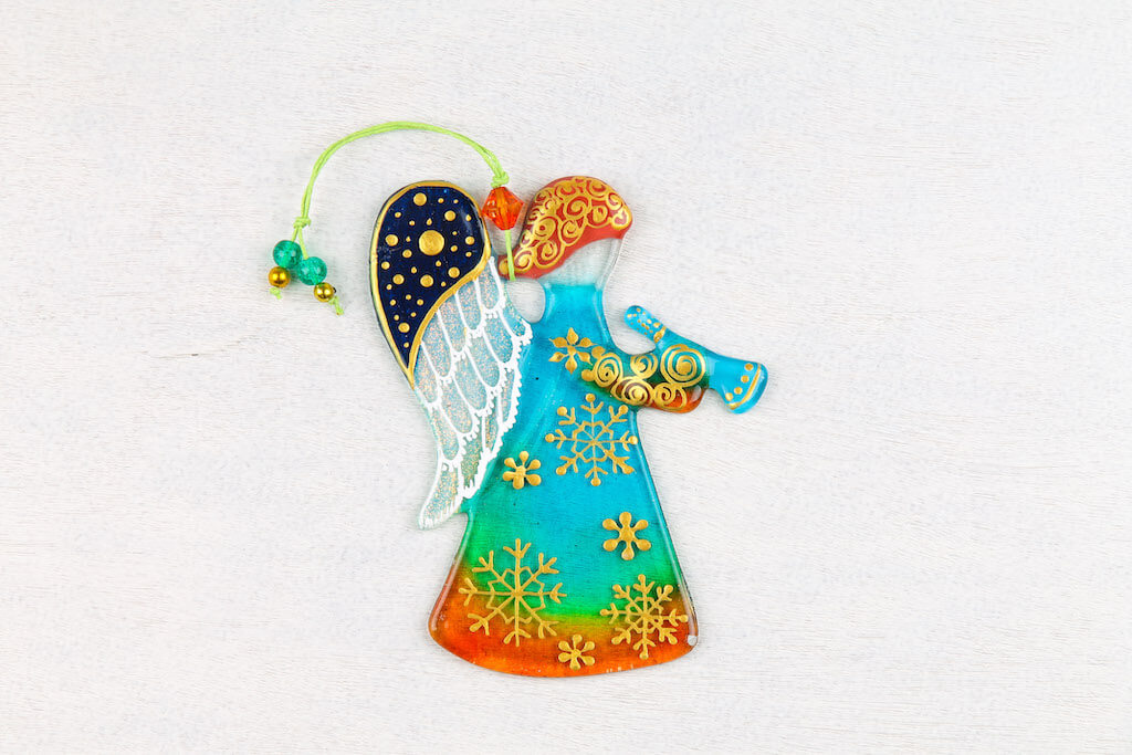 This beautifully handcrafted glass wall art combines light blue and orange hues, symbolizing peace and energy. Its vibrant colors and intricate design create a sense of calm and protection, making it a perfect addition to any space.
