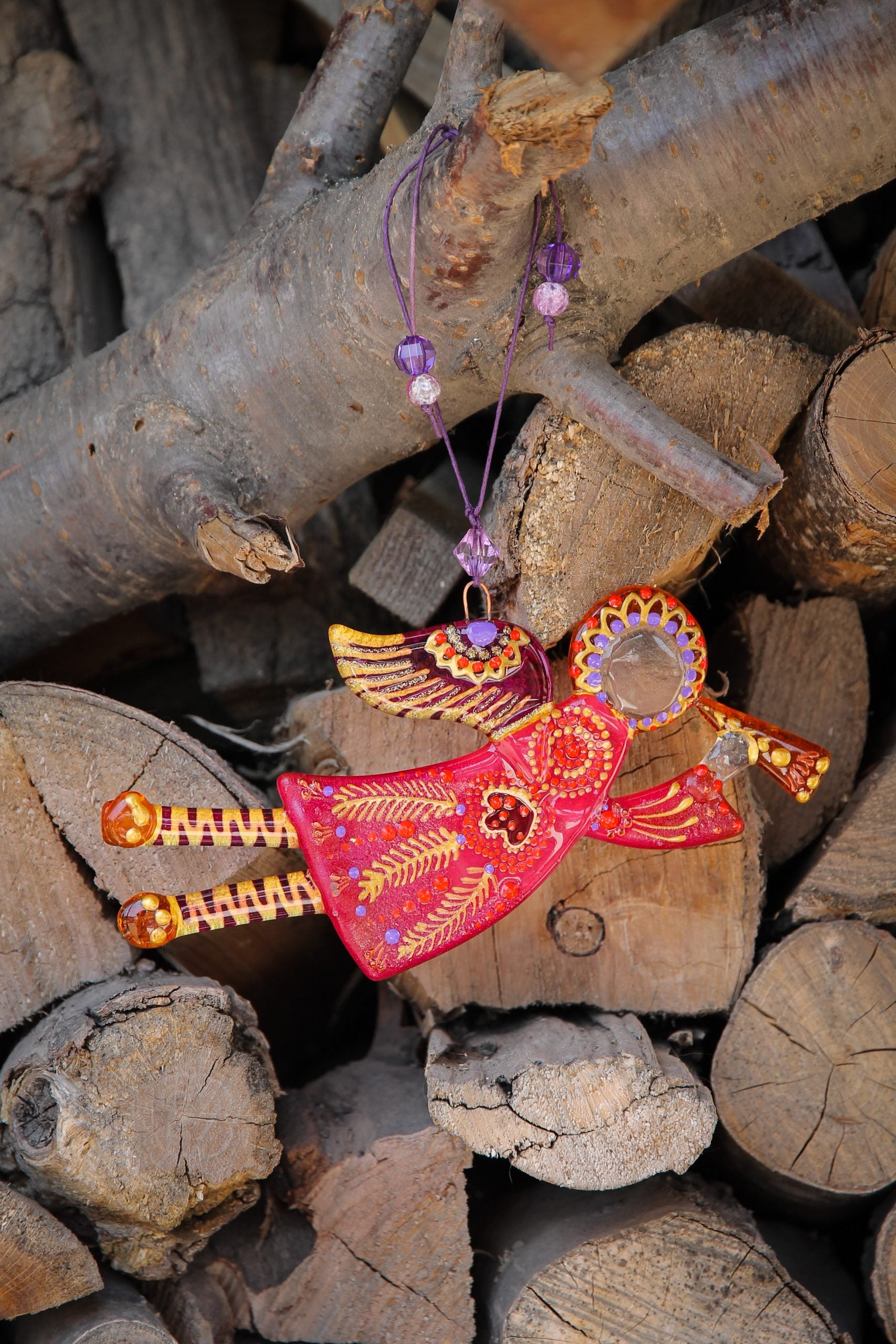 This handmade Guardian Angel Glass Wall Art in red and purple radiates warmth, love, and protection. Crafted from fused glass, it brings a touch of serenity and charm to any space. A heartfelt gift or a unique home accent.